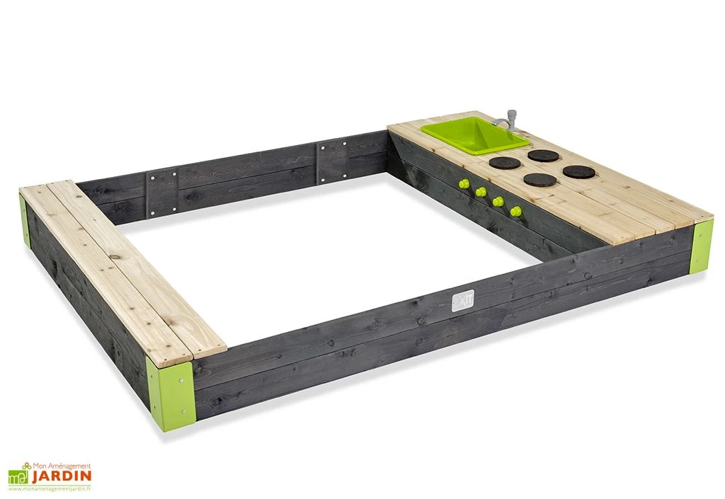 Le bac à sable Aksent de chez Exit Toys est destiné aux enfants âgés d’au moins 3 ans. Il intègre un espace cuisine avec évier et accessoires (vaisselle, aliments en plastique…). Un compartiment de rangement, situé sous le plan de travail de la cuisine, pourra d’ailleurs accueillir ces accessoires et d’autres jouets une fois le jeu fini.