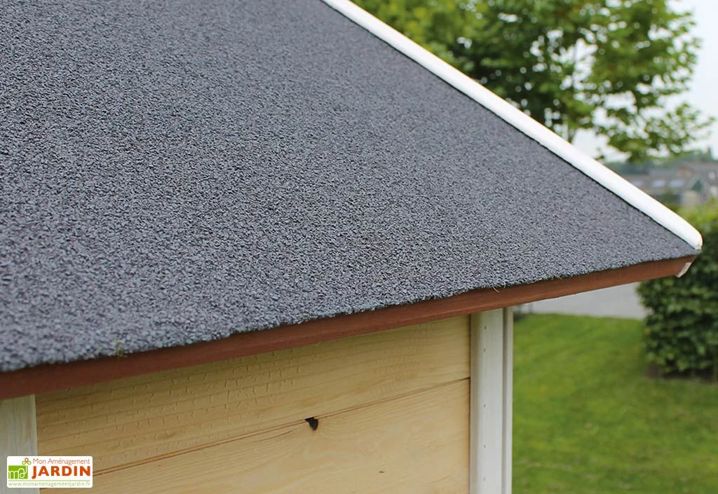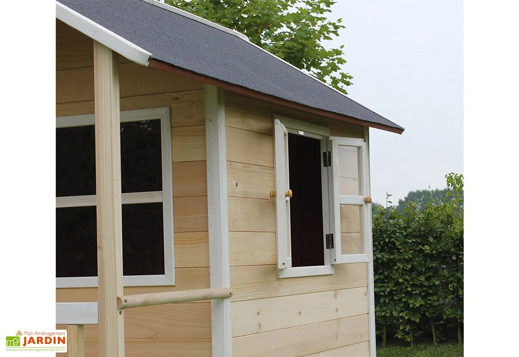 Disponible en trois coloris (naturel, vert ou rouge), cette maisonnette en bois a vu ses parois lasurées (lasure en phase aqueuse) et préassemblées, facilitant ainsi leur installation. Ces parois accueillent un toit à deux pentes couvert d’un revêtement bitumeux 100% étanche. Ce toit couvre également la plateforme, offrant ainsi un abri extérieur contre la pluie.