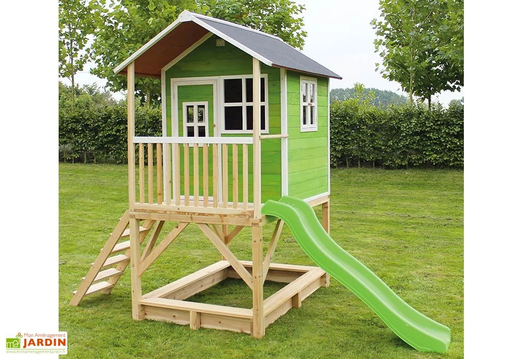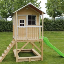 La maisonnette pour enfant Exit Toys Loft 500 est montée sur pilotis, ce qui lui permet de posséder un toboggan et un bac à sable. Sa plateforme, accessible grâce à un escalier légèrement incliné, dessert en effet un toboggan en plastique d’une longueur de glisse de 1,80 m et abrite un bac à sable dans lequel les plus petits pourront s’amuser.