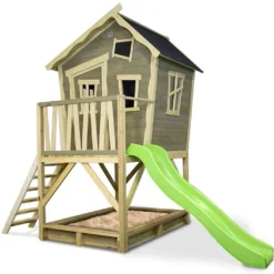La maisonnette pour enfant Exit Toys Crooky 500 est légèrement surélevée, ce qui lui permet d’accueillir un toboggan. Elle possède en effet une plateforme de 94 cm de haut sous laquelle se trouve un bac à sable et qui donne accès à un toboggan en plastique d’une longueur de glisse de 1,80 m.