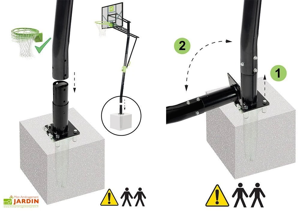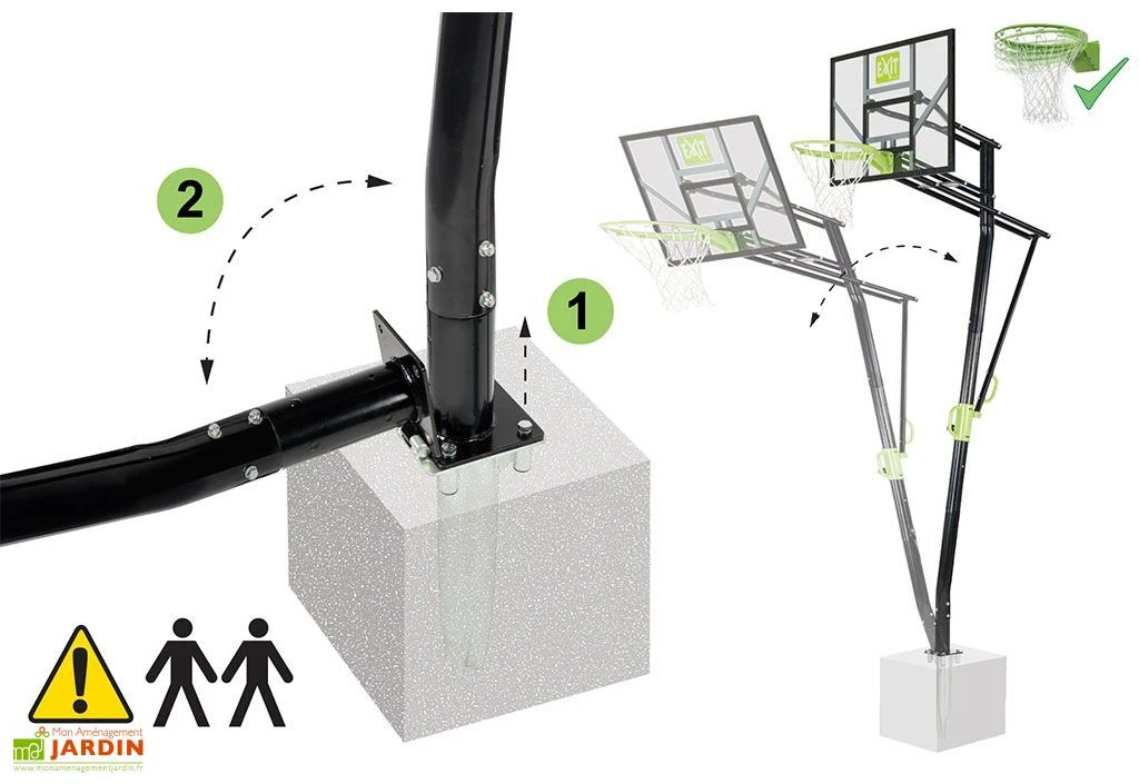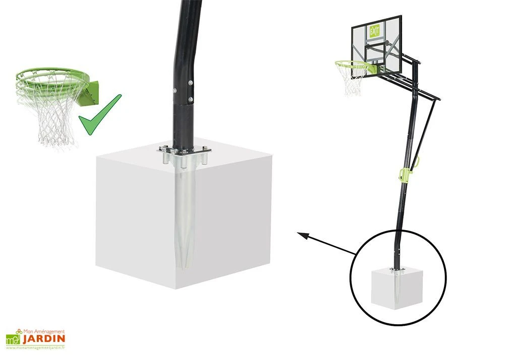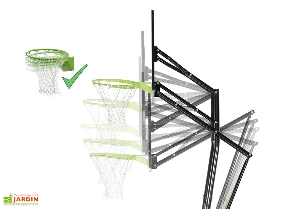 Votre panier de basket Galaxy de chez Exit Toys sur pied est composé d’un pied support, d’un panneau de 116 x 77 cm en polycarbonate, d’un arceau flexible spécial « Dunk » et d’un filet.