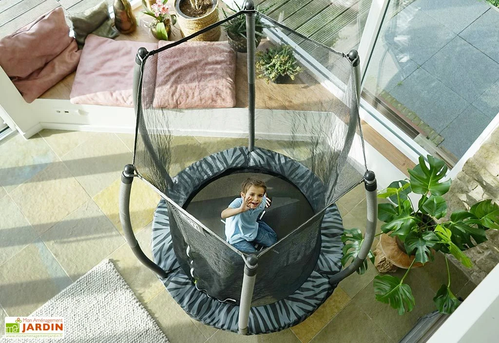 Facile d’accès, notamment grâce à l’entrée située dans le filet et à un cadre haut d’un peu plus de 30 cm, ce trampoline pour tout-petits pourra être installé en intérieur comme en extérieur. Il résistera parfaitement aux intempéries, et ce sans entretien particulier. Notez qu’il devra être monté par vos soins, mais que son assemblage ne requiert aucune vis, facilitant ainsi l’opération.
