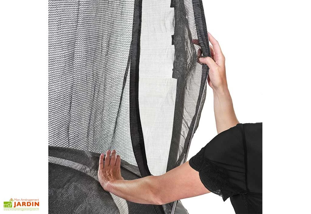 Le trampoline sur pieds est fourni avec un filet de protection de 180 cm de hauteur disposant d’une entrée superposée qui se ferme automatiquement afin qu’elle ne reste jamais ouverte de façon inopinée. Ce filet est maintenu par des poteaux (6) recouverts de mousse apportant une sécurité supplémentaire à vos bambins. Grâce à cela, vos enfants et leurs amis pourront s’amuser en toute sécurité durant les belles journées ensoleillées.
