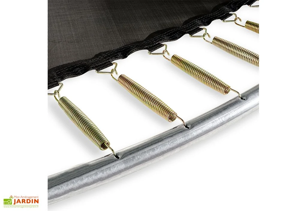 Les ressorts galvanisés sont recouverts par un coussin de protection noir en PVC rembourré de 22 mm d’épaisseur d’une mousse EPE offrant une excellente protection et qui de plus absorbe facilement l’eau lors des intempéries. Ce trampoline sur pieds est équipé d’un système appelé « Foot Protection System », un filet situé entre la zone de saut et le bord de protection évitant ainsi à vos enfants de mettre leurs pieds entre les ressorts.