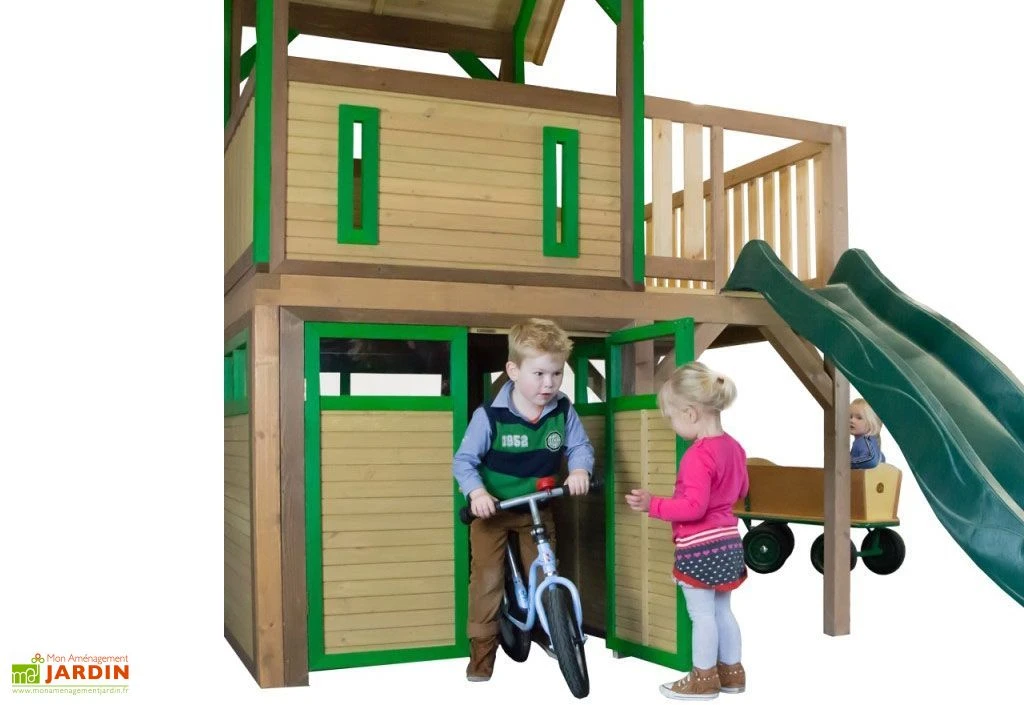 Le garage en bois Drive-in s’installe sous les cabanes de la marque Axi permettant ainsi de leur ajouter un espace de stockage supplémentaire pour ranger les vélos, trottinettes ou créer une petite cabane.