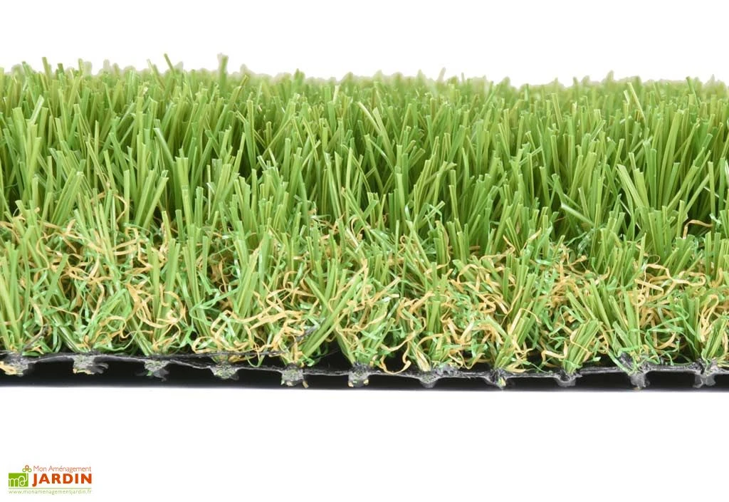 Le gazon synthétique Oasis 40 mm fabriqué par Faura propose 4 teintes de verts et de bruns différentes pour un aspect naturel. Ces nuances sont mates et les brins qui composent la pelouse sont de tailles et de formes différentes, ce qui permet d’apporter encore plus de réalisme à l’ensemble.