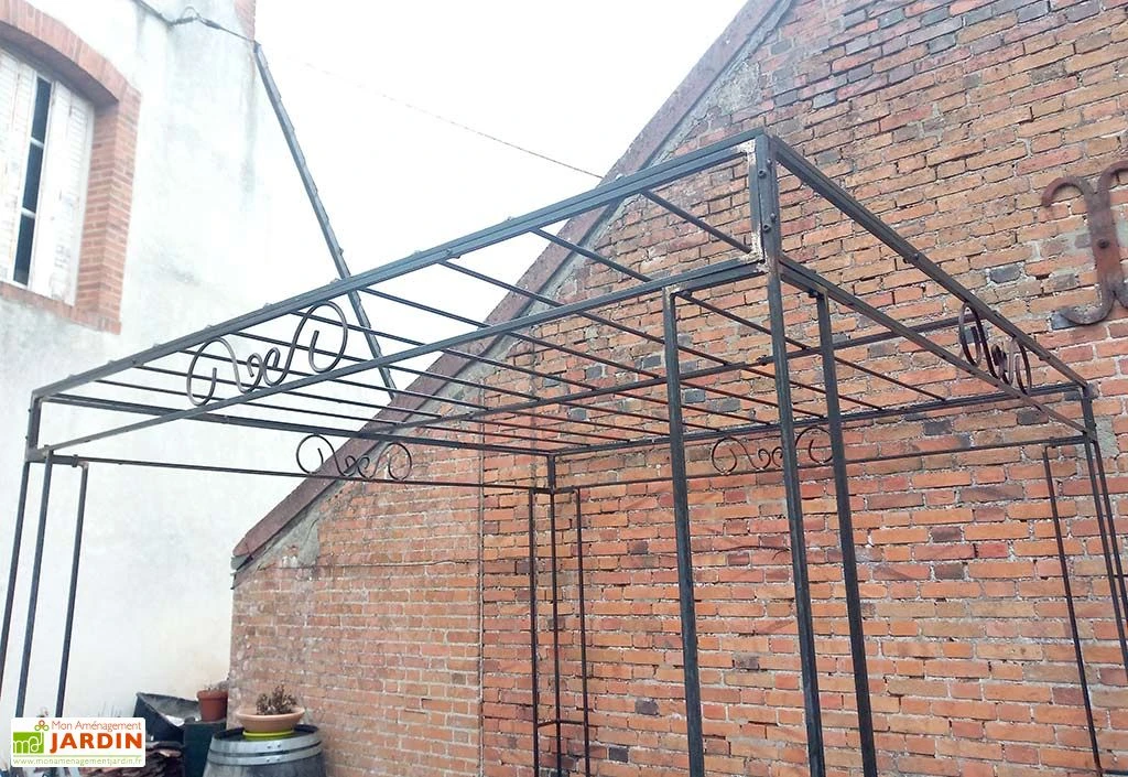 La tonnelle en fer forgé est composée de tiges carrées de 14 mm et de tiges rondes de 10 mm. Les décors sont constitués de tiges carrées de 8 mm. Si vous choisissez la finition de base, brute, vous pourrez la laisser rouiller pour un look vintage. Vous pouvez également choisir une peinture époxy pour recouvrir la structure.