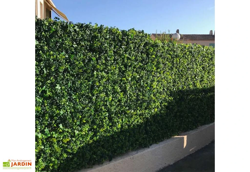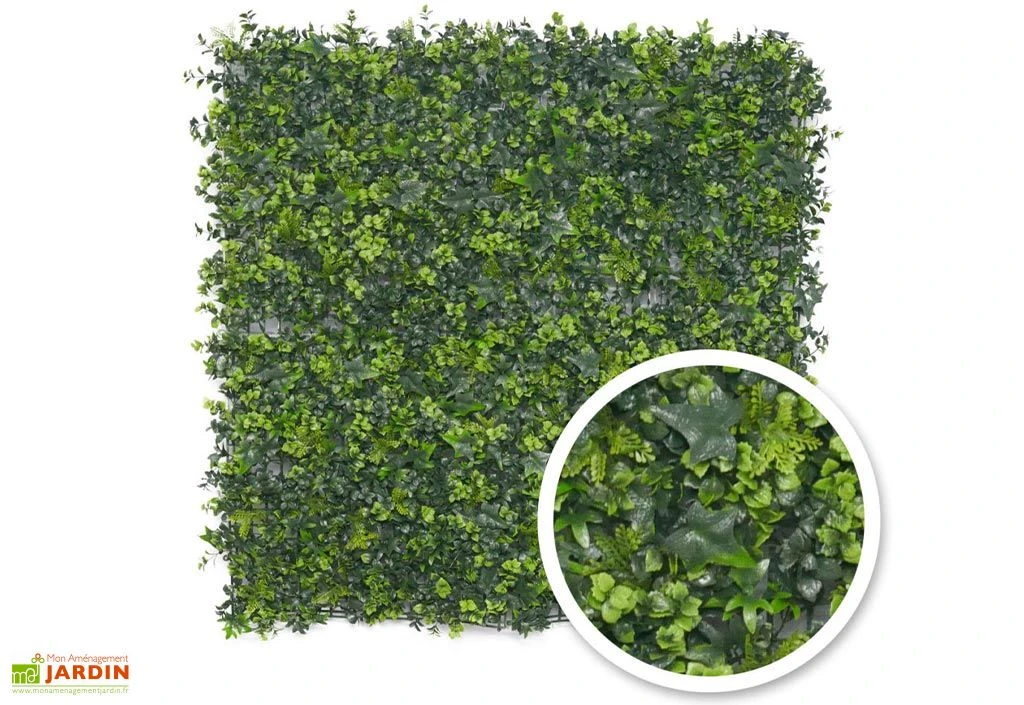 Cette haie artificielle de chez France Green mesure 1 x 1 m, soit 1 m². Elle repose sur un support à face simple en plastique et comporte 4 carrés de 25 x 25 cm. Ils sont clipsés entre-eux grâce au système d’attaches intégré. Son feuillage imite parfaitement le lierre et est composé à 100 % de polyéthylène.