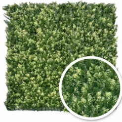 Cette haie artificielle signée France Green mesure 1 x 1 m, soit 1 m². Elle imite à la perfection l’aspect d’une haie de sapins parfaitement taillée. Ce feuillage artificiel repose sur 4 plaques de plastique de 25 x 25 cm clipsées entre elles. Vous pourrez assembler très facilement plusieurs plaques grâce aux attaches intégrées, pour recouvrir l’ensemble de votre palissade.