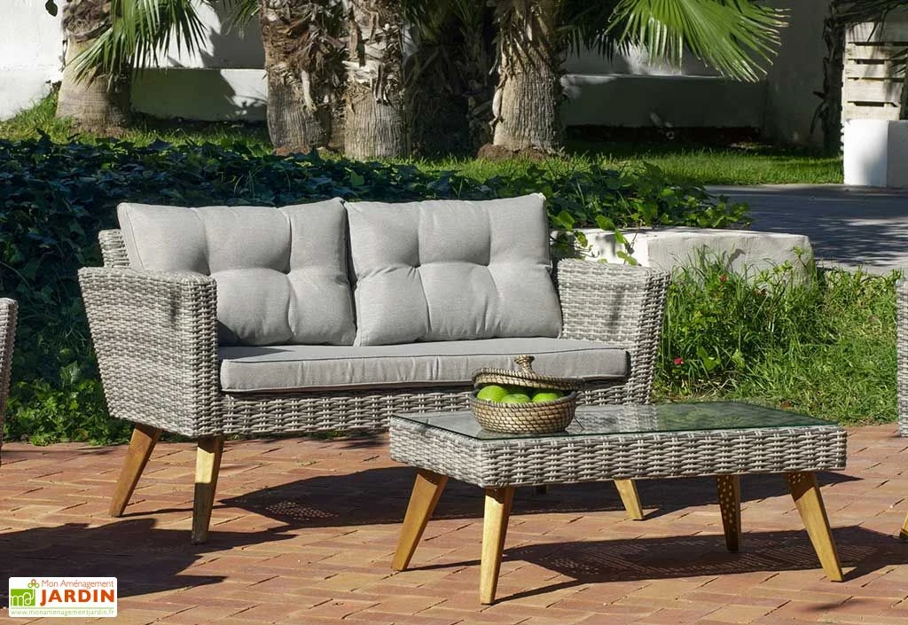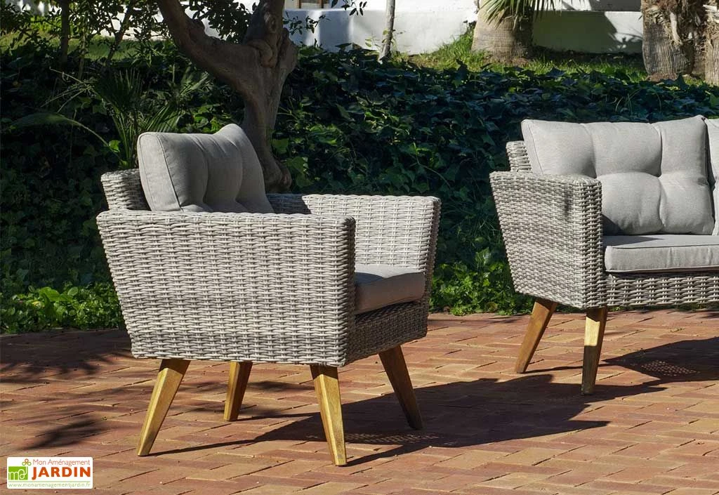 L’ensemble du mobilier de jardin dispose d’une structure solide en résine tressée, un matériau robuste qui résiste parfaitement aux agressions extérieures comme les intempéries ou la corrosion par exemple, et il ne demande que très peu d’entretien. Le salon de jardin peut donc rester dehors toute l’année sans aucun risque. Les divers éléments qui composent ce salon de jardin sont équipés de pieds en bois d’acacia.