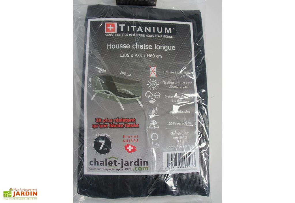 Cette housse noire signée Titanium est pensée pour protéger votre chaise longue des intempéries. Elle mesure 205 x 75 x 60 cm, est indéchirable et 100% étanche, ce qui lui permet de résister à bien des agressions extérieures. Cette housse de protection est par ailleurs traitée anti-UV, ce qui signifie qu’elle ne décolorera pas, et ce même après plusieurs années passées à l’extérieur. Un cordon de serrage est présent afin d’assurer la bonne fixation de la housse sur le bain de soleil.