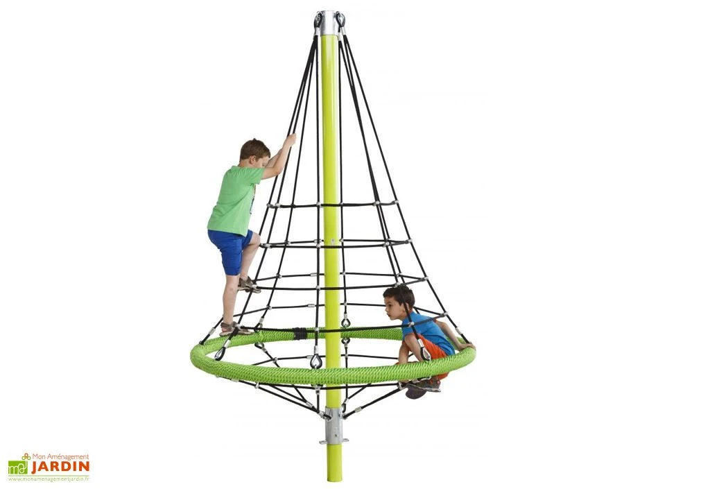 Le jeu à grimper de chez KBT est en cordes armées solides de 16 mm de diamètre. Il mesure 2,70 m de hauteur et 3,56 m de largeur. Les connecteurs sont en aluminium, un matériau résistant à la corrosion. Le pilier central est thermolaqué par poudrage avec capuchon galvanisé à chaud. Le jeu à grimper doit être ancré dans le béton. L’ancrage est inclus. La structure ne tourne pas. Le jeu peut être installé aussi bien chez un particulier que dans une collectivité. Il est certifié TÜV. La garantie est de deux ans.