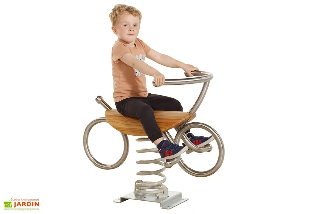 Le jeu à ressort Natural Line de chez KBT consiste en un vélo en acier inoxydable avec assise en bois de mélèze, le tout reposant sur un ressort de 17 cm de diamètre. Les matériaux utilisés étant parfaitement adaptés à un usage en extérieur, ils ne craindront ni les intempéries, ni la rouille ou autres chocs susceptibles d’endommager l’ensemble, et ce sans qu’aucun entretien ne soit nécessaire.