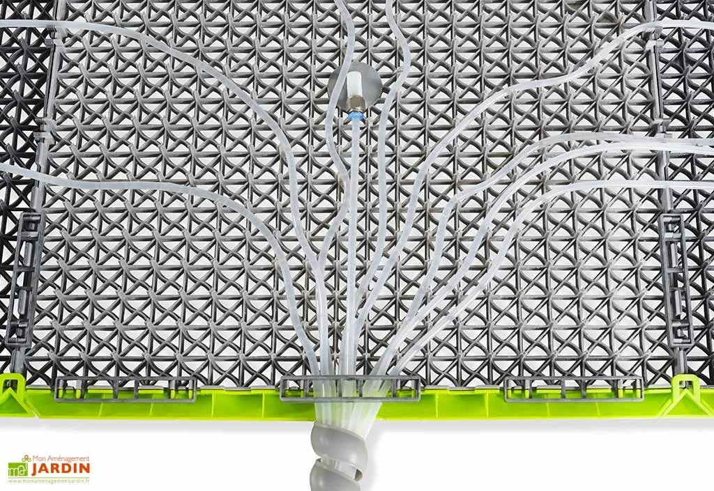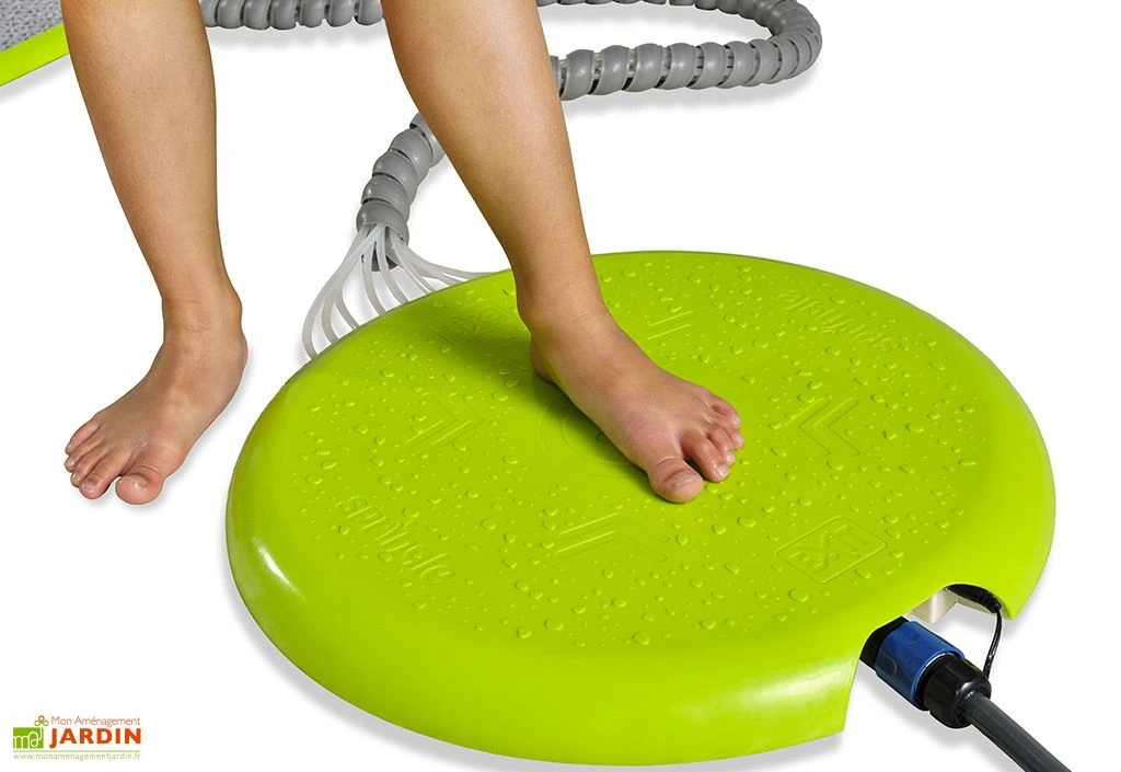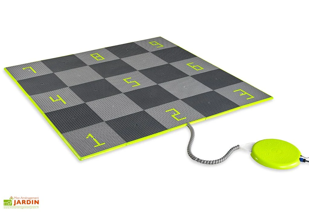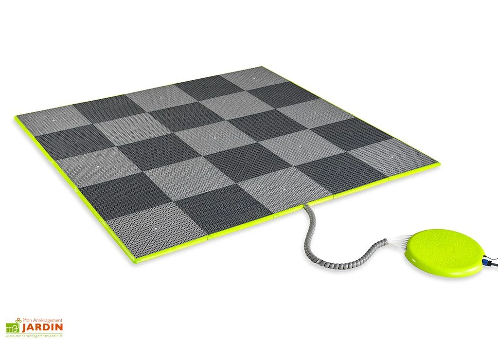 Le jeu d’eau Sprinqle L de chez Exit Toys consiste en un carré de 250 cm de côté constitué de 25 tuiles conçues en polypropylène et ABS. Neuf de ces tuiles sont reliées à autant de tuyaux permettant d’acheminer l’eau des jets déclenchés grâce à une pédale de commande. Ces jets pourront également être contrôlés via l’application pour smartphone du Sprinqle, compatible Android et iOS.