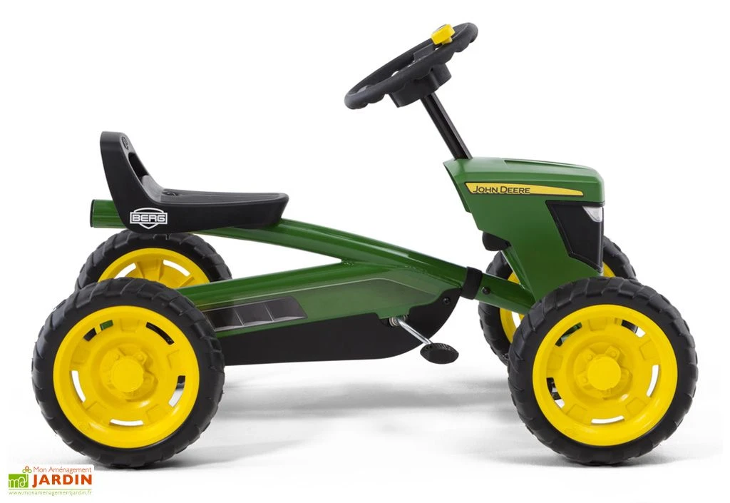Ce kart pour enfant de la marque Berg arbore les couleurs du célèbre fabricant de matériel agricole John Deere. Votre enfant est fasciné par les tracteurs ? Offrez-lui un modèle à sa taille, qu’il pourra piloter tout seul ! Ce kart à pédales est en effet doté d’un essieu oscillant qui lui garantit une grande stabilité et une parfaite adhérence pour que les plus jeunes enfants puissent conduire en toute sécurité et en pleine confiance.