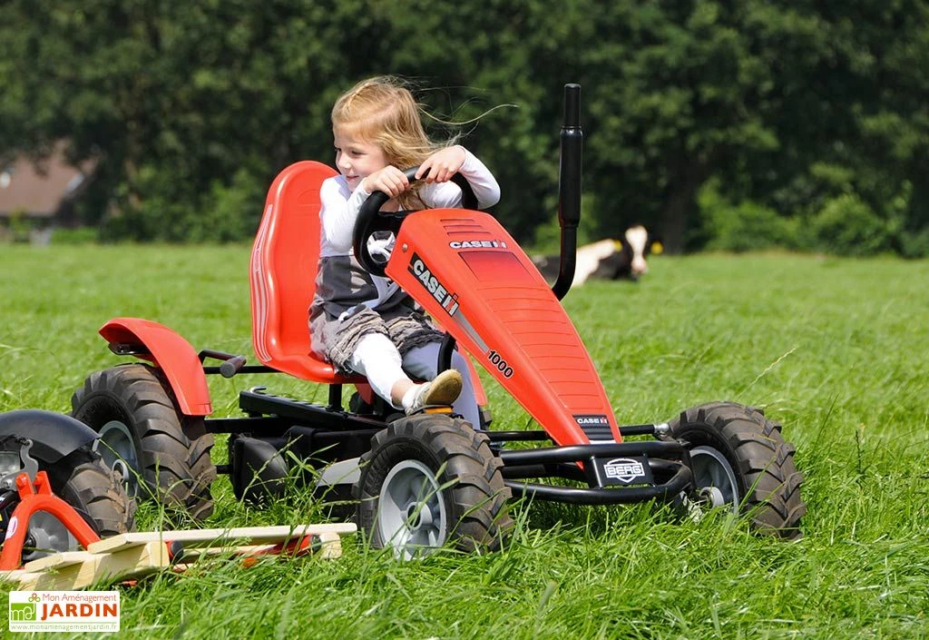 Le kart à pédales Berg Case IH s’est vu doté d’un design qui n’est pas sans rappeler celui d’un tracteur, et arbore même la fameuse couleur rouge des machines agricoles de la marque américaine Case IH. Il offre toutefois une conduite bien plus souple qu’un véritable tracteur, notamment grâce à son essieu oscillant conçu pour compenser les irrégularités de terrain.