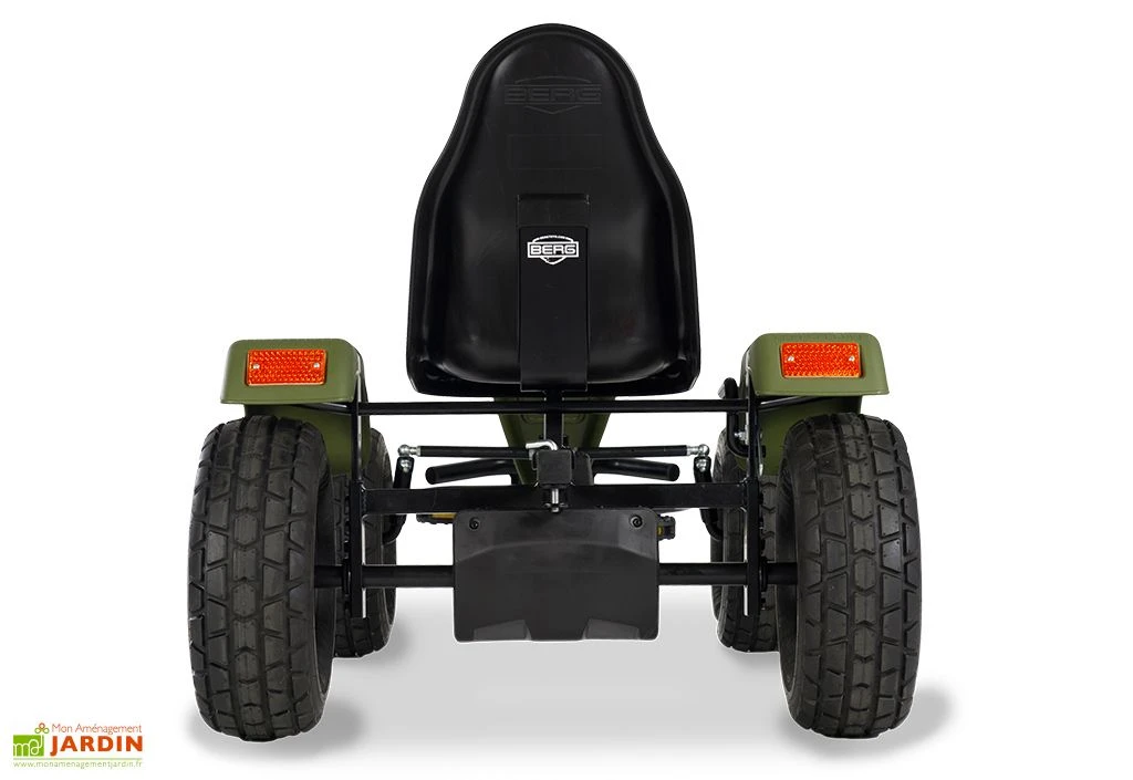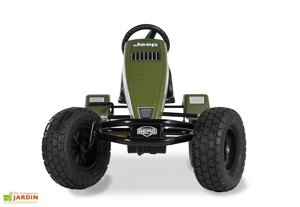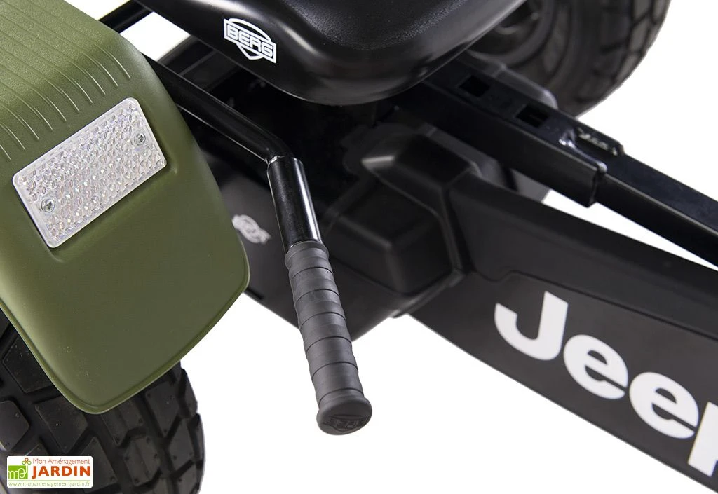 Le kart à pédales Jeep Revolution de chez Berg est à la fois robuste et maniable. Conçu pour s’attaquer à n’importe quelle surface, il possède de véritables pneus à air, tout-terrain, ainsi qu’un essieu oscillant pensé pour compenser les imperfections du sol, qu’il s’agisse de terre, de graviers ou de sable.