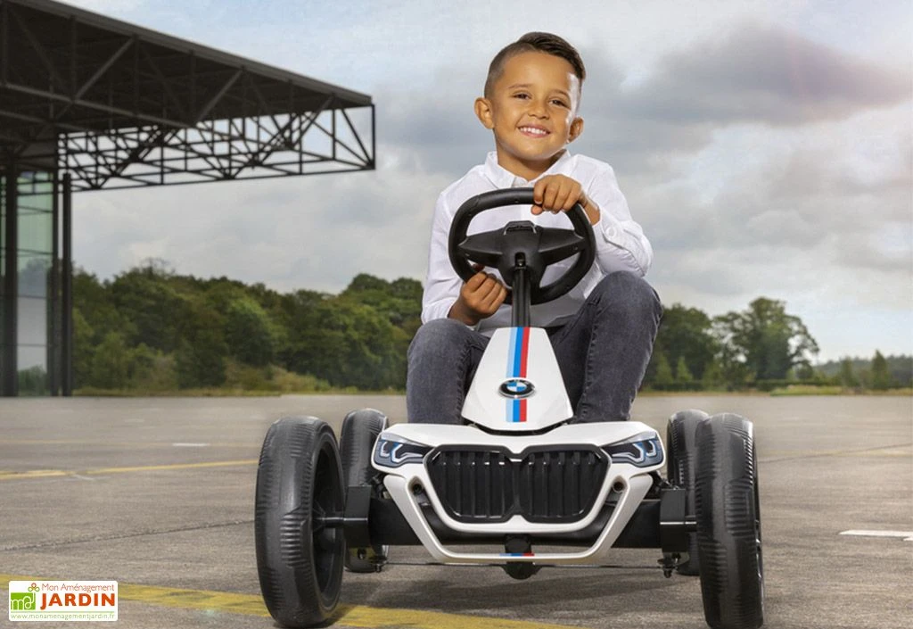 Ce kart à pédales aux couleurs de BMW est conçu pour les enfants âgés d’au moins 2 ans et demi. Son siège et son volant ajustables lui permettront cependant de suivre la croissance de votre petit et de convenir aux enfants jusqu’à 6 ans (poids maximum de 40 kg). Votre enfant pourra donc profiter de son bolide pendant plusieurs années !