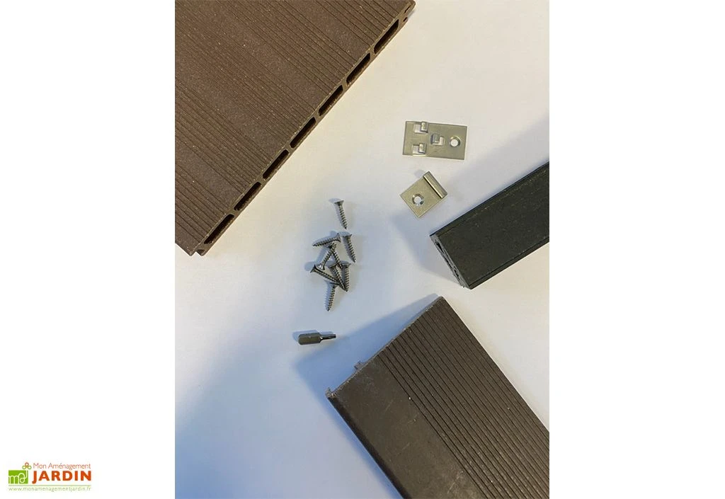 Les clips de départ (10) et de fixation (150) sont fournis avec le kit de lames de terrasse. Ils sont invisibles lorsque le montage de votre terrasse est terminé, et permettent aux lames rainurées d’être proches les unes des autres afin que rien ne puisse passer au travers. Les lames sont réversibles et s’unissent facilement entre elles.