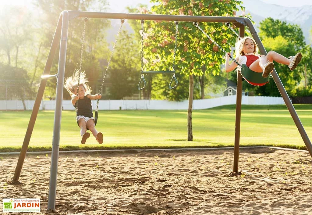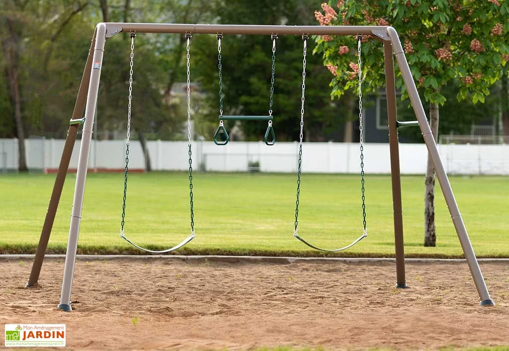 Vous n’imaginez pas le temps que peut passer un enfant sur une balançoire ! Ce portique en métal de chez Lifetime offrira à vos enfants de nombreuses heures de jeu en plein air, en toute sécurité, entre frères et sœurs ou entre copains ! Pensé pour les enfants dès 3 ans, il compte deux balançoires et un trapèze avec anneaux de gym et pourra donc accueillir jusqu’à trois enfants simultanément.