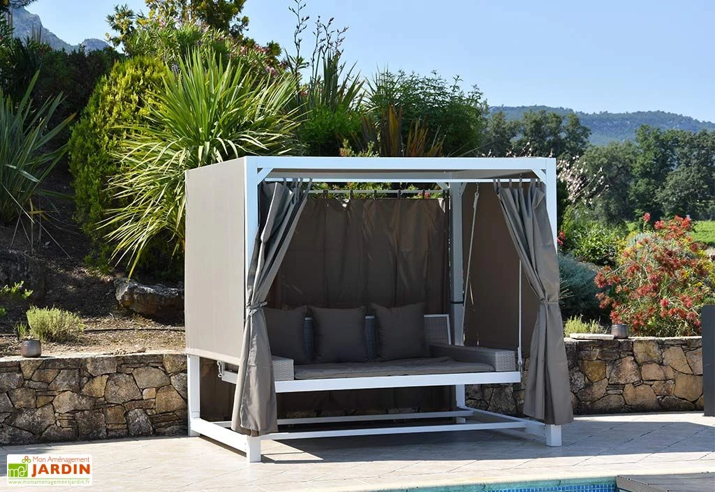 Livré en kit, à monter par vos soins, ce lit balancelle de jardin affiche des dimensions de 180 x 236 cm, pour 210 cm de haut. Il possède un dossier et des accoudoirs en rotin synthétique ainsi qu’un matelas de 5 cm d’épaisseur revêtu de tissu. Trois coussins complètent le tout. Afin de vous protéger des pluies fines comme du soleil, cette balancelle s’est vue dotée d’un auvent et de quatre rideaux en polyester 160 gr/m².