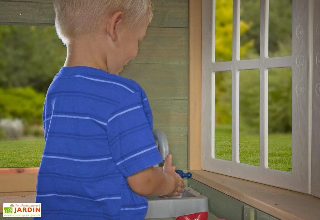 La maisonnette pour enfants est livrée toute équipée ! En plus de très jolies façades au style victorien, l’intérieur de la cabane dispose d’une cuisine moderne avec :