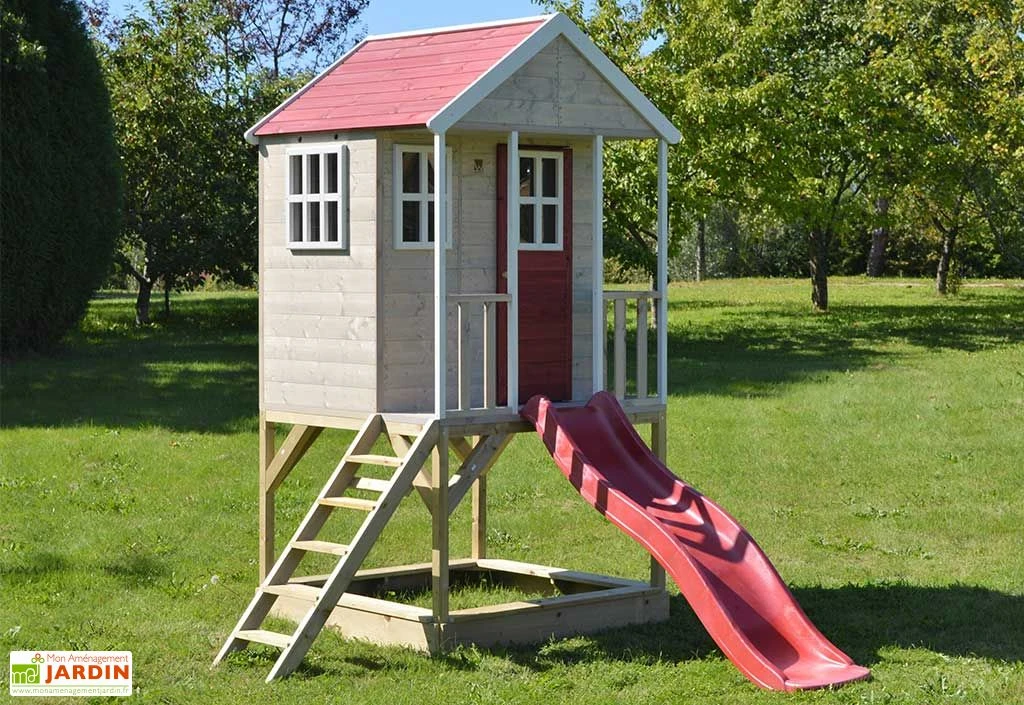 Cette maisonnette pour enfant de chez Wendi Toys est montée sur pilotis, ce qui lui permet d’accueillir un toboggan en plastique et de proposer un espace pour bac à sable, situé sous la plateforme. Cette dernière est facilement accessible grâce à un petit escalier, permettant aux jeunes enfants, dès 3 ans, de profiter d’une totale autonomie. A noter que cette aire de jeux en bois est conforme à la norme EN 71.