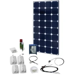 Le panneau solaire est livré avec un régulateur de charge Schaudt LR 1218 de 20A permettant de relier le panneau à une batterie (non incluse). Le régulateur de charge permet de charger deux batteries à la fois. Il permet d’obtenir du courant 12V. Il sera nécessaire d’utiliser un onduleur si vous souhaitez obtenir du 230V.