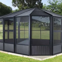 Ce gazebo est doté de parois en aluminium et d’une toiture en acier galvanisé chargée de vous offrir un peu d’ombre les jours d’été, mais aussi un abri en cas de pluie. L’inclinaison de cette toiture permettra d’ailleurs d’assurer le bon écoulement des eaux pluviales pendant une averse. L’aluminium et l’acier galvanisé sont des matériaux intéressants puisque robustes et insensibles à la corrosion, même sans traitement ni entretien. Même la visserie est en inox, ce qui signifie que l’ensemble de la structure pourra passer l’hiver dehors sans craindre la rouille.