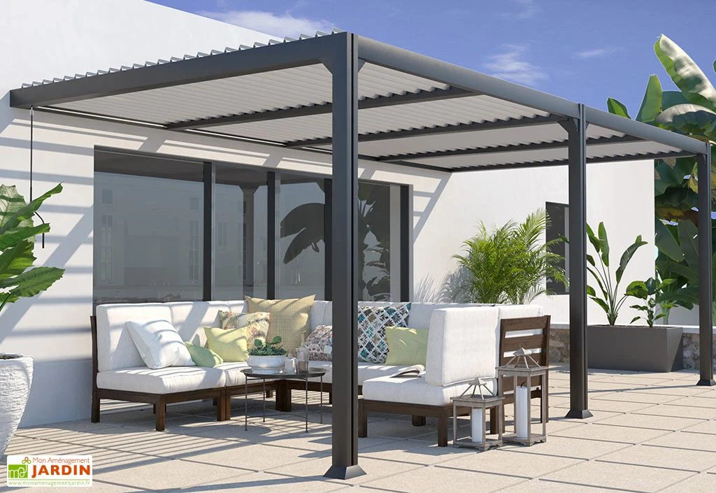 Pour encore plus de protection contre le soleil, sachez qu’il est possible d’insérer des brise-vues dans les glissières prévues à cet effet sur la structure de la pergola en alu.