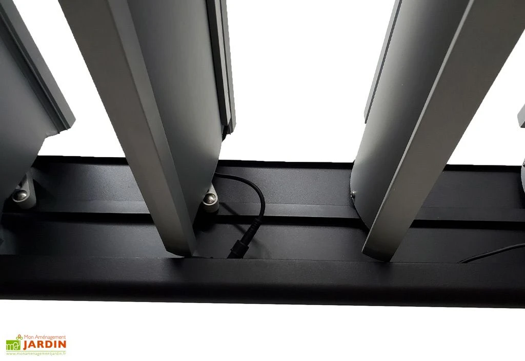 5 de ces lames orientables sont équipées de LED permettant d’apporter un éclairage nocturne. Vous pourrez également contrôler cet éclairage grâce à l’interrupteur sur le poteau. La connectique est réalisée par fiches sécurisées IP68.