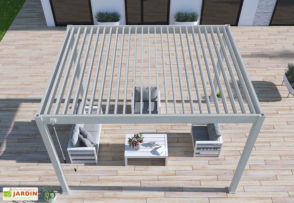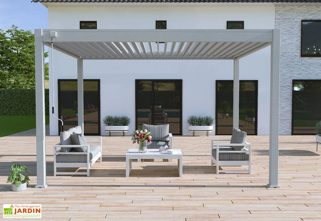 Cette pergola bioclimatique signée Ombréa mesure 3,97 x 3,03 m de côté pour 2,56 m de hauteur. Elle est présentée ici dans sa version autoportée gris perle.