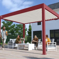 Cette pergola bioclimatique signée Ombréa revêt une peinture rouge basque originale (RAL 3004) offrant un design coloré et contemporain à l’ensemble. Elle est entièrement fabriquée en aluminium pour une résistance parfaite face à la corrosion et ne vous demandera donc aucun entretien.