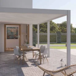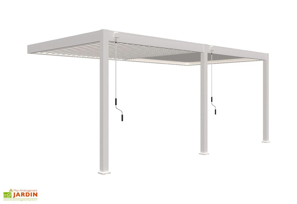 Sa toiture est composée de 38 doubles lames orientables en aluminium blanc que vous pouvez orienter manuellement jusqu’à 135° grâce à deux manivelles incluses. Chaque manivelle pourra contrôler une partie de la toiture indépendamment de l’autre. Les lames sont étanches et un système de drainage évacue l’eau de pluie à l’intérieur des poteaux. Des extensions sur les poutres cachent les lames en position ouverte, offrant une finition parfaite.