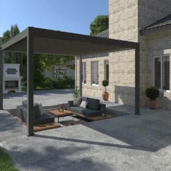 Cette pergola bioclimatique signée Ombréa possède une surface de près de 16 m² grâce à des dimensions de 3,99 x 3,99 m de côté pour 2,56 m de hauteur. Ses dimensions et sa hauteur de passage de 2,36 m permettent de circuler facilement sous sa structure et d’y installer un salon de jardin ou un spa par exemple.