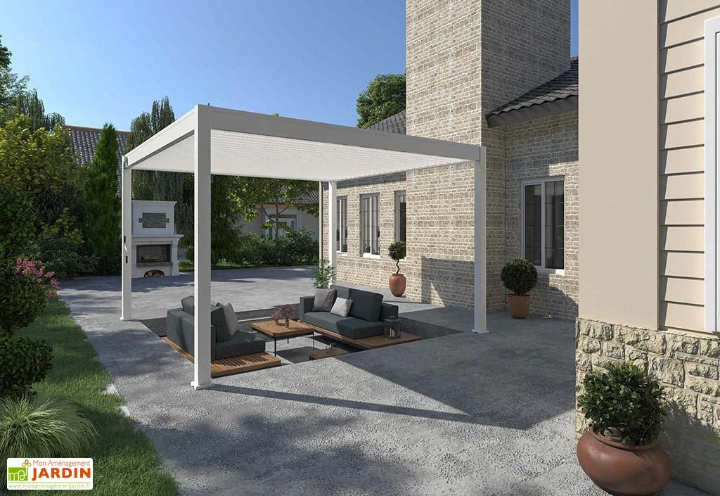 Sa toiture est équipée de doubles lames orientables que vous pourrez contrôler manuellement à l’aide d’une manivelle. Les 25 lames en aluminium pourront être orientées jusqu’à 135° et offrir une très bonne étanchéité lorsqu’elles sont fermées. Un système d’évacuation de l’eau par drainage va renforcer cette protection contre la pluie. Lorsqu’elles sont ouvertes les lames sont totalement invisibles. En effet, des extensions placées sur les poutres de toit vont venir les cacher de l’extérieur pour une finition parfaite.