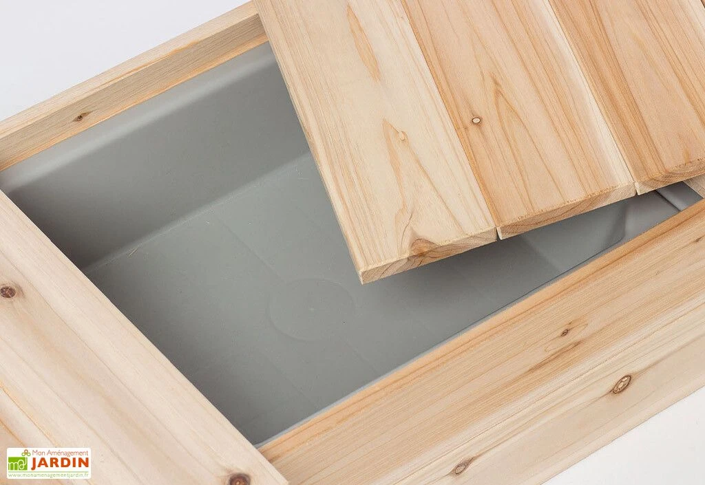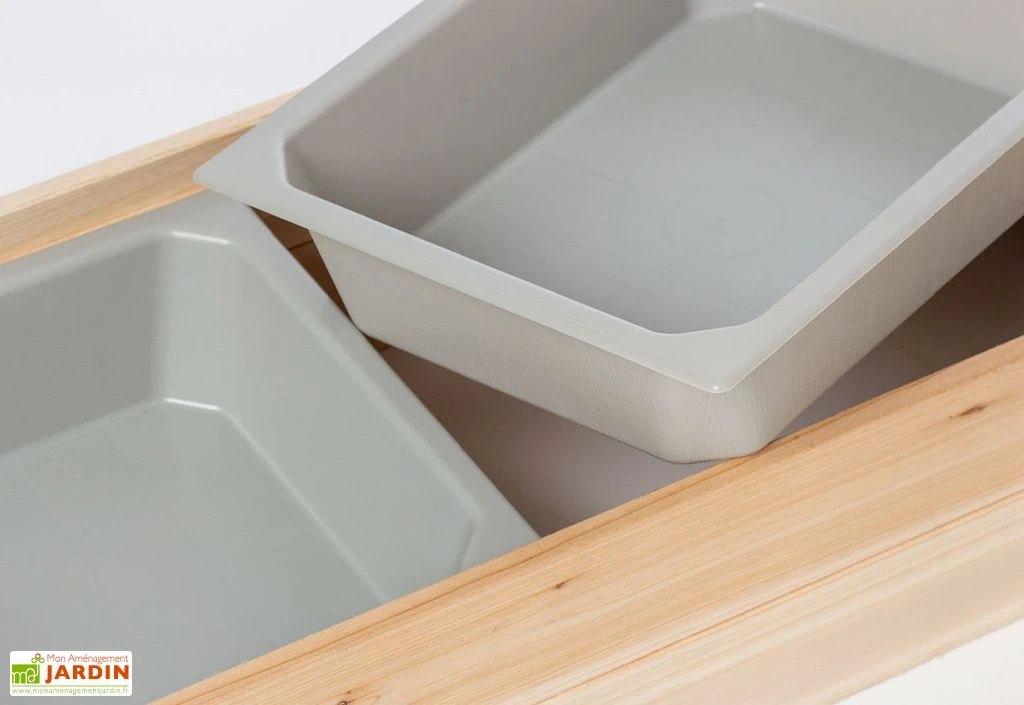 Ses deux bacs en plastique recouvrables d’une capacité de 5 L chacun permettent de ranger les différents outils tels que les seaux et pelles afin de les avoir à portée de main. En plus d’être solide et non traité, le bois utilisé pour cette structure (sapin) est certifié FSC, il est donc conforme aux procédures de gestion durable des forêts.