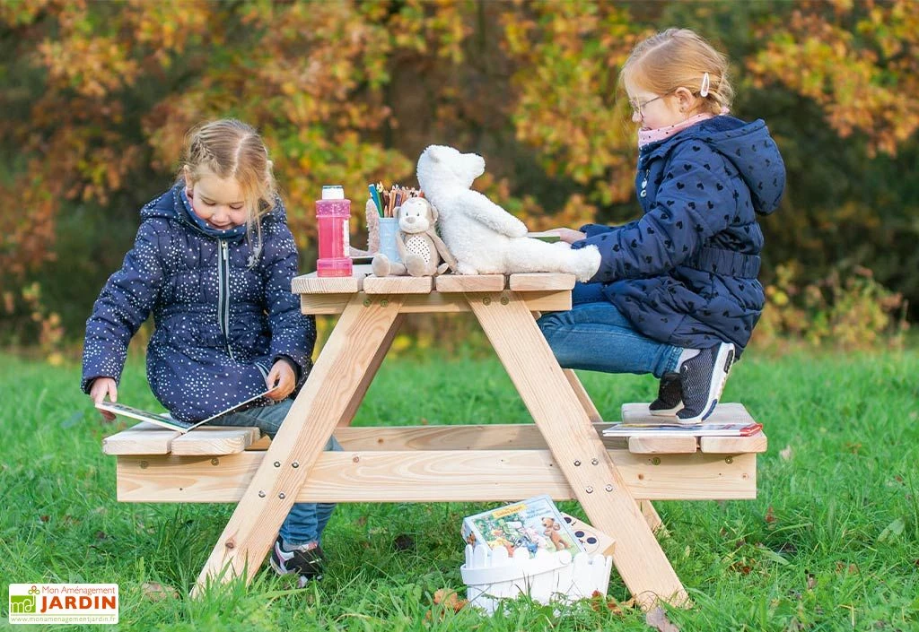Cette table de pique-nique en bois pour enfant mesure 118 cm de longueur, 119 cm de largeur et 65 cm de hauteur. Elle est composée d’une table et de 2 bancs situés à 36 cm de hauteur. Chaque banc pourra supporter un poids max de 100 kg ce qui permet aux parents de partager un moment avec leurs enfants.