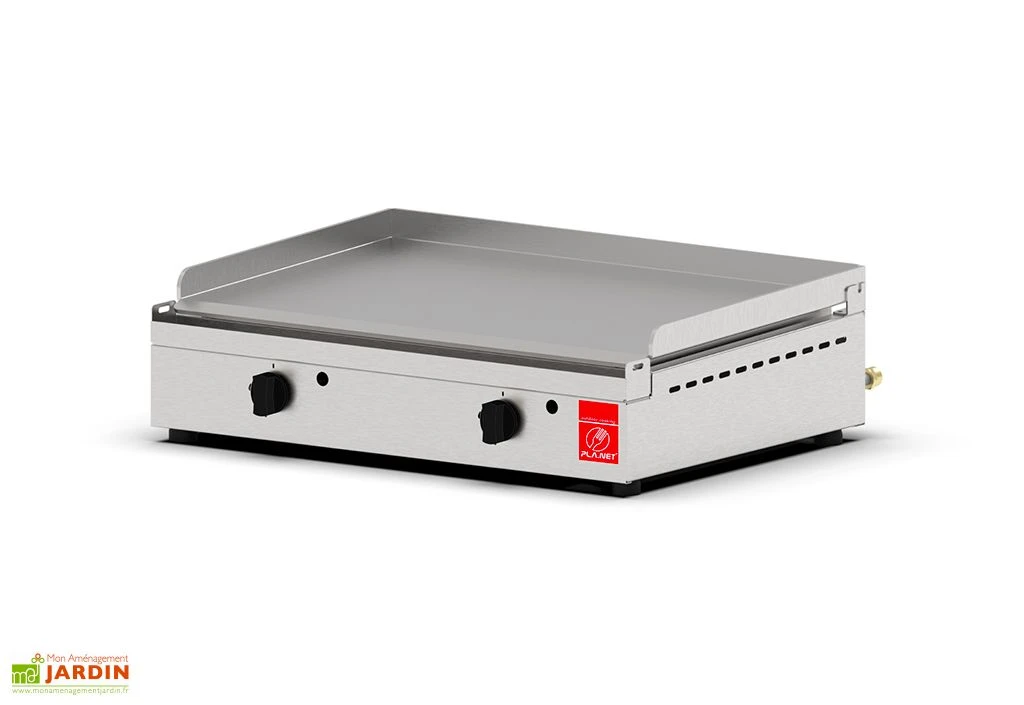 La plancha à gaz Alfa 600 de chez Pla.Net est livrée accompagnée d’un chariot de transport sur roulettes et d’une housse de protection sur mesure. Elle est équipée d’une plaque lisse en inox de 5 mm d’épaisseur offrant une surface de cuisson de 40 x 60 cm, selon deux zones. Cette plaque de cuisson permet par ailleurs la découpe et ne modifiera jamais le goût de vos aliments.