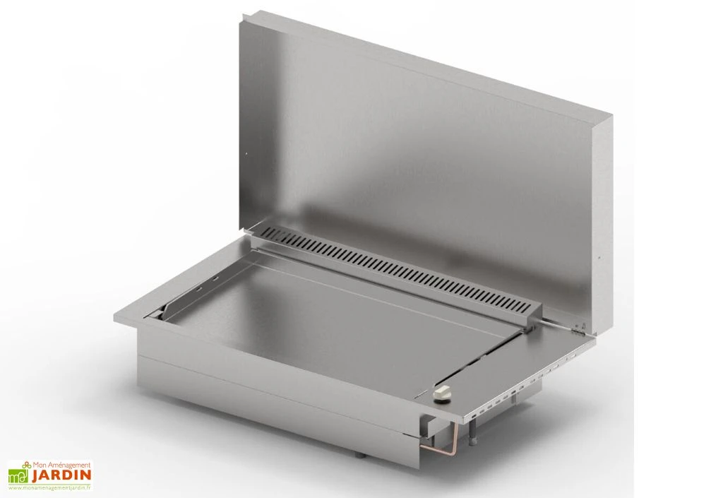 La plancha encastrable OASI 80 de PlaNet faite en inox 304 permet de cuire les aliments sans risque pour la santé ni de modification du goût. La taille de la plancha est la suivante : 103 x 56 x 20 cm. Afin d’encastrer la plancha, il faut une découpe selon ces dimensions : 100 x 53 x 38 cm.
