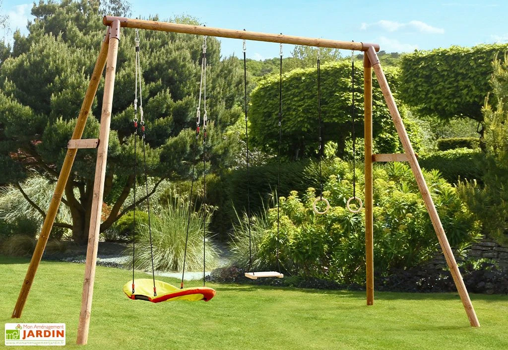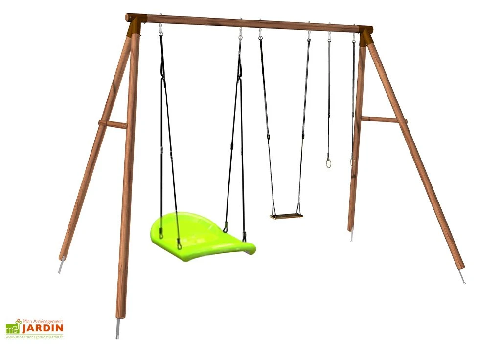 Spécialement conçu pour les adultes et pour les ados à partir de 14 ans, ce portique balançoire plait grâce à l’originalité de ses agrès. En effet, en plus d’une balançoire classique et d’une paire d’anneaux, une balançoire bateau est incluse. Utilisez cette balançoire bateau en position assise, debout ou allongée ! Chaque agrès pourra supporter un poids de 80 kg max.