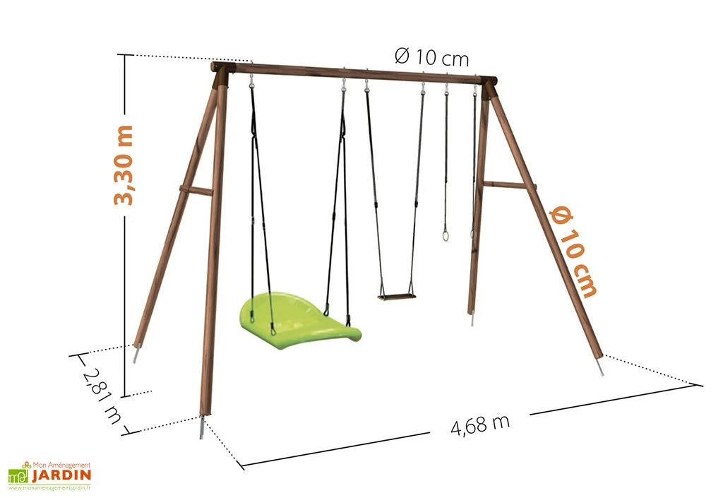 Ce portique adulte mesure 4,68 m de longueur, 2,81 m de profondeur et 3,30 m de hauteur. Il comprend 4 poteaux de 10 cm de diamètre reliés à une poutre de 10 cm de diamètre par des angles en acier. Les pattes de scellement nécessaires à l’ancrage sont incluses. Il ne vous reste plus qu’à les sceller dans des plots béton (non fournis) pour assurer la stabilité de l’ensemble.