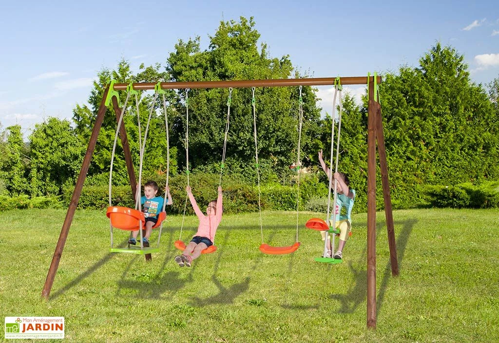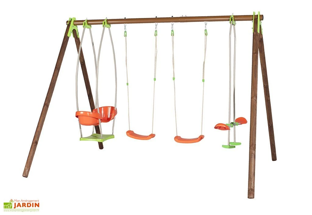 Le portique Bongo de chez Trigano est conçu pour les enfants âgés de 3 à 12 ans. Il leur propose deux balançoires, une face-à-face et une nacelle, le tout fabriqué en plastique. Les balançoires pourront par ailleurs être réglées afin de les adapter à la taille de vos enfants. Facile à installer, ce portique mesure 2,18 m de long, 3,57 m de large et 2,30 m de haut. Pour éviter qu’il ne bascule et ainsi assurer une sécurité optimale, il devra être impérativement scellé dans du béton.