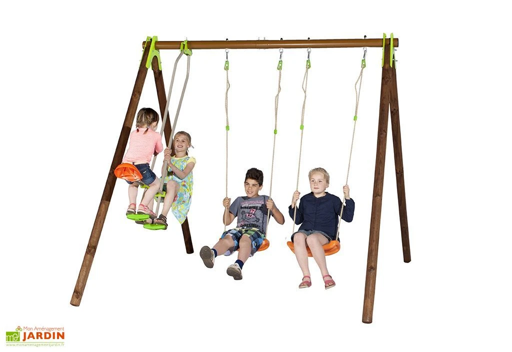 Ce portique est livré avec trois agrès : deux balançoires et une face-à-face, le tout en plastique. Résistantes et ergonomiques, ces balançoires sont confortables et réglables. Vous pourrez donc les adapter à la taille de vos enfants (de 3 à 12 ans). Facile à installer, le portique affiche des dimensions de 2,18 m x 3,03 m, pour 2,30 m de hauteur. Il devra être impérativement scellé dans du béton afin de garantir une sécurité optimale. Les pattes de scellement sont d’ailleurs incluses.
