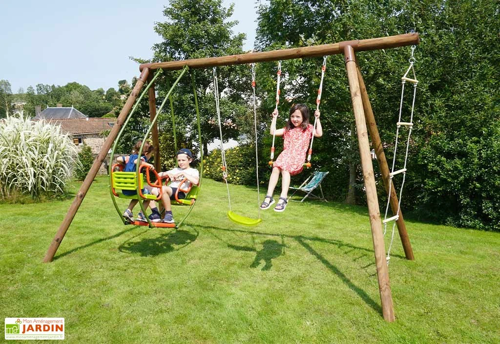 Le portique Juliette de la marque Soulet est équipé d’une balancelle pouvant supporter un poids de 70 kg maximum ainsi que d’un trapèze, d’une balançoire et d’une échelle pouvant supporter 50 kg maximum chacun. Il peut accueillir 5 enfants de 3 à 12 ans et mesure 3,48 x 1,89 x 2,22 m.