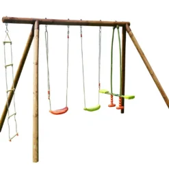 Le portique mesure 3,18 x 1,89 x 2,22 m et peut accueillir 5 enfants âgés de 3 à 12 ans. Il est livré avec 2 balançoires, 1 échelle et 1 face-à-face. Ses quatre agrès peuvent supporter 50 kg maximum chacun sauf la face-à-face qui peut supporter 70 kg maximum.