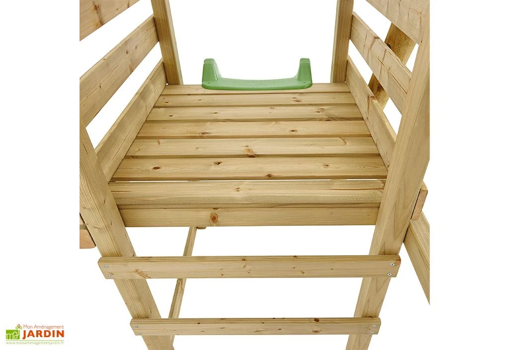 Le portique en bois de chez TP Toys propose de multiples activités pour ravir les enfants de 3 ans minimum. Vous retrouverez ainsi une balançoire ainsi qu’un toboggan et son échelle pour satisfaire tout le monde. Ce portique s’élève sur 2,4 m de hauteur, et mesure 2,49 m de longueur pour 3,78 m de largeur. L’ensemble de la structure pourra supporter une charge maximale de 150 kg au total, et de 60 kg pour la balançoire.