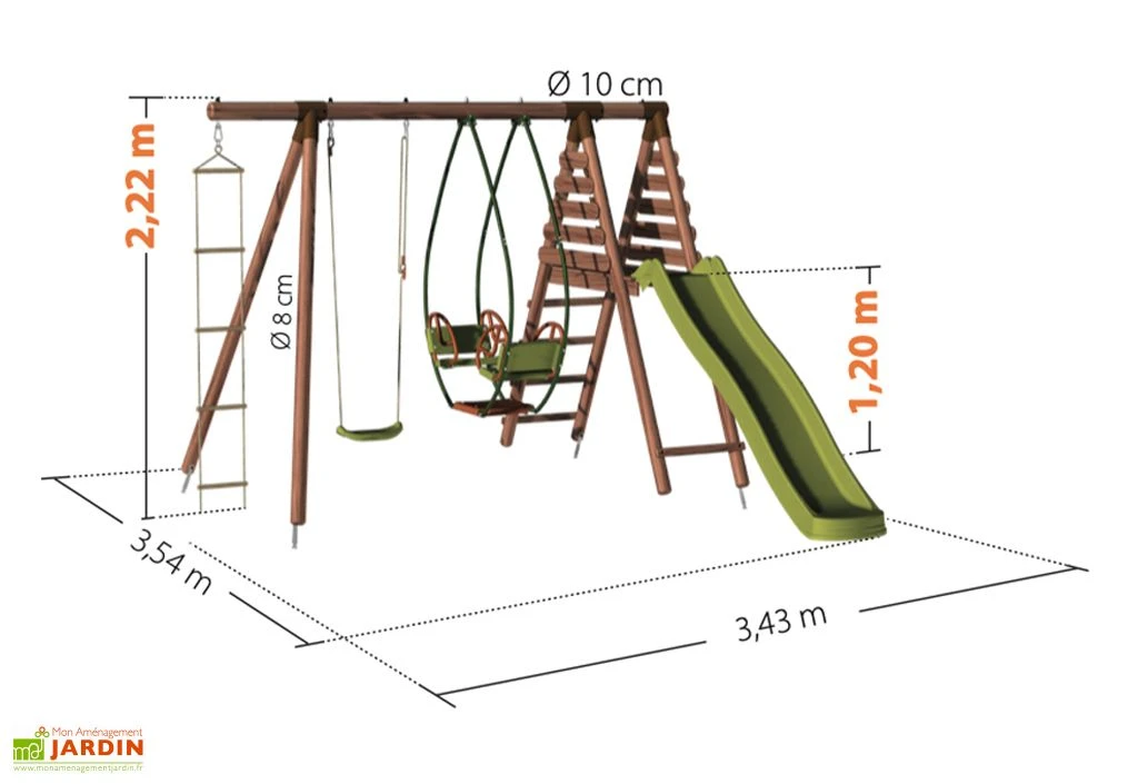 Conçu pour accueillir 5 enfants âgés de 3 à 12 ans, le portique en bois bénéficie d’un toboggan, d’une balançoire, d’une échelle pouvant respectivement supporter 50 kg maximum ainsi que d’une balancelle pouvant supporter 70 kg maximum. La plateforme du toboggan est sécurisée grâce à un garde-corps et des cales anticoincement, elle se situe à 1,20 m de hauteur.