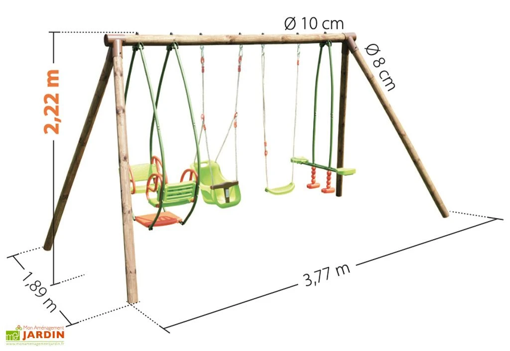 Le portique en bois est conçu pour accueillir 6 enfants âgés de 3 à 12 ans. Il mesure 3,77 x 1,89 x 2,22 m et est équipé d’une balancelle et d’une face-à-face pouvant supporter respectivement 70 kg maximum ainsi que d’une balançoire pouvant supporter 50 kg maximum. Il y a également un siège pour bébé (15 kg maximum) avec ceinture pour les enfants de 6 à 24 mois.