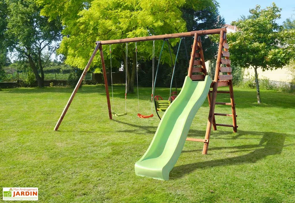Conçu pour accueillir 5 enfants âgés de 3 à 12 ans, le portique est équipé d’un toboggan et de deux balançoires pouvant respectivement supporter 50 kg maximum ainsi que d’une balancelle pouvant supporter 70 kg maximum.